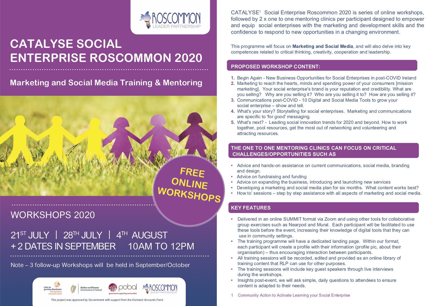CATALYSE Social Enterprise Roscommon is a series of online workshops, followed by 2 x 1 to 1 mentoring clinics per participant designed to empower and equip social enterprises with the marketing and development skills and the confidence to respond to new opportunities in a changing environment.